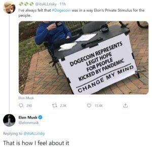 ماسک در پاسخ به یک توییت روز جمعه مبنی بر اینکه دوج کوین به نوعی محرک خصوصی ایلان برای مردم بود گفت: احساس من راجع به آن اینگونه است. این توییت شامل تصویری از یک علامت است که می گوید: نظرم را عوض کن.