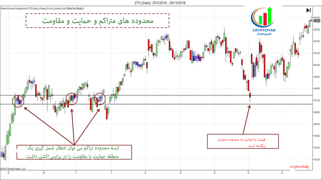 مناطق آبی زیر مناطق ازدحام است که در معاملات روزانه با پرایس اکشن تعیین شده است.